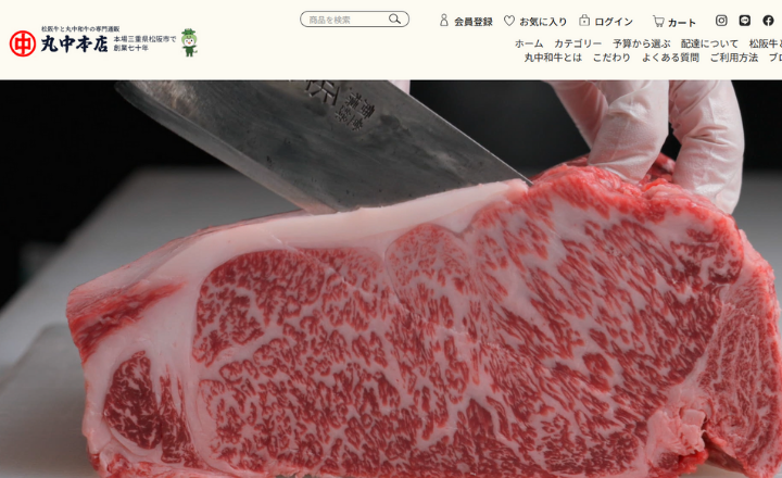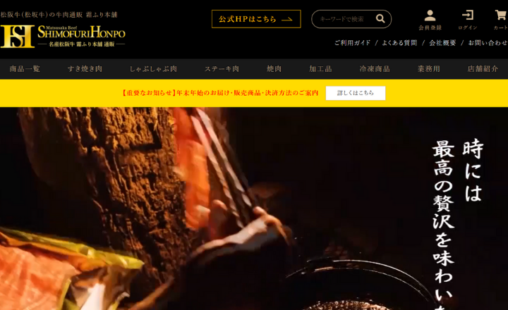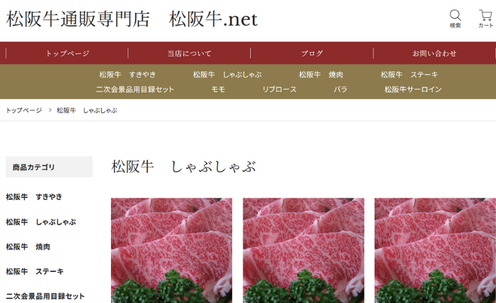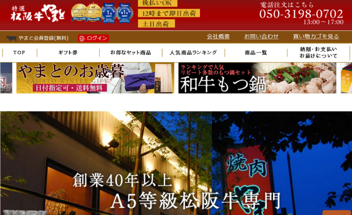 - トップページから堂々と「自家牧場で育てた松阪牛」をアピールする専門通販サイト